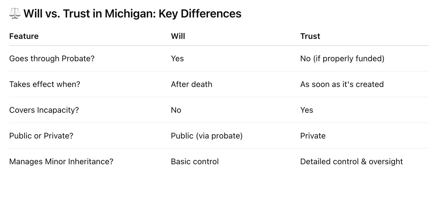 In Michigan, both wills and trusts are legal tools used in estate planning—but they serve different purposes. Understanding the difference can help you make smarter decisions for yourself and your family.